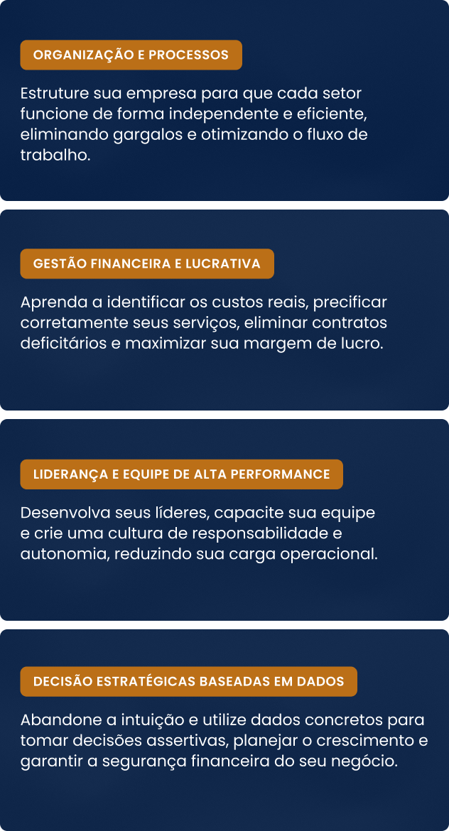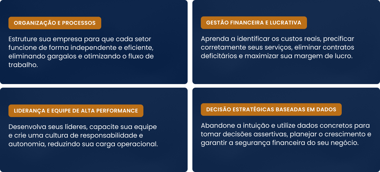 Pense no custo de continuar com prejuízos, decisões erradas e a exaustão de gerenciar tudo sozinho. A mentoria é um investimento que se paga rapidamente com o aumento da lucratividade e eficiência operacional que você vai alcançar.
