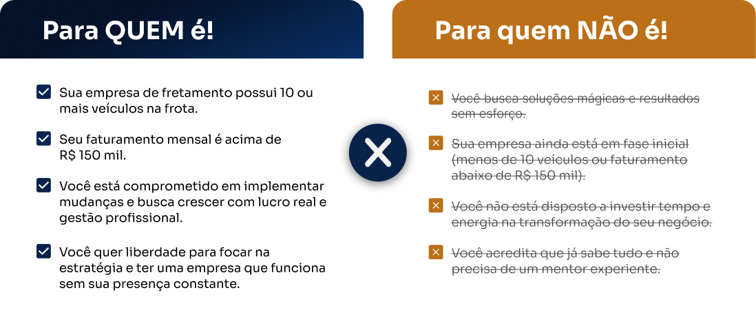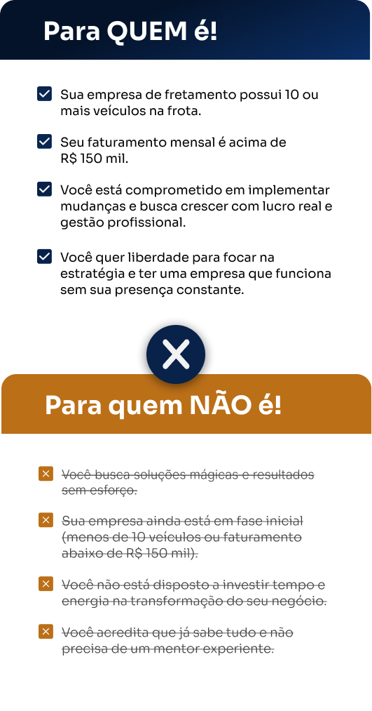 É um programa exclusivo e intensivo, desenhado para donos de empresas de fretamento de ônibus que buscam transformar seus negócios em operações altamente lucrativas, eficientes e autogerenciáveis. Não é um curso teórico, mas um acompanhamento prático e estratégico, onde você terá acesso direto ao conhecimento e à experiência de quem já trilhou esse caminho com sucesso.